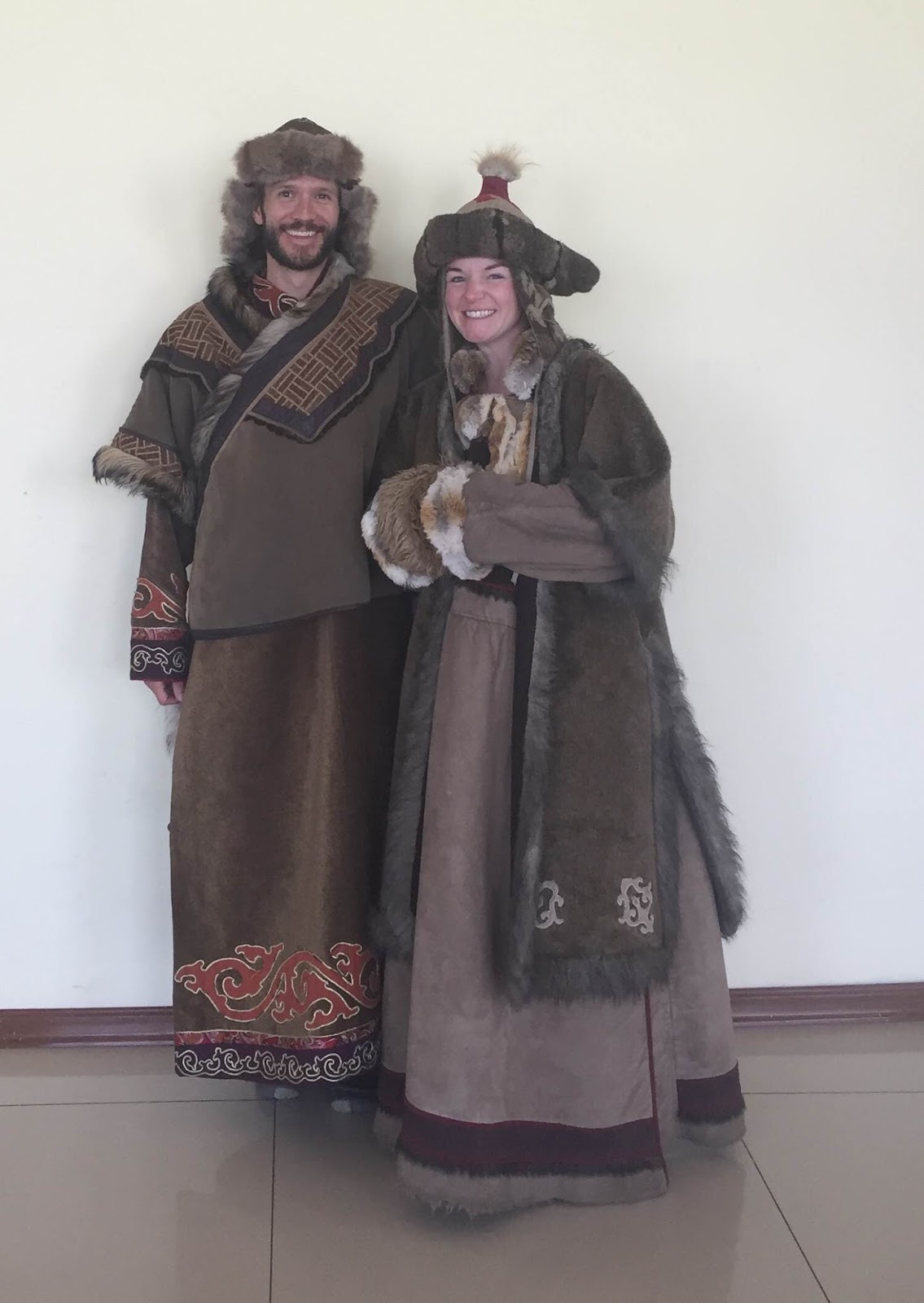 Dressing up in traditional clothing in Mongolia.